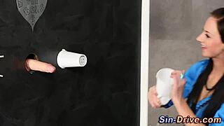 Classy babe dominates gloryhole with intense bukkake sucking
