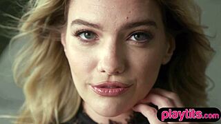 Slender blonde milf strips lingerie flaunts perky boobs