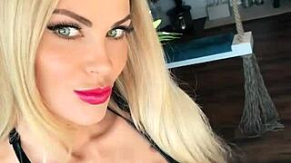 Russian blonde teases in tight leather and high heels