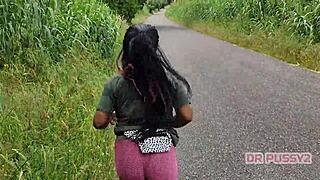 ebony with big ass in leggings running alone in the forest