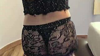 Beautiful lesbian teases with her big ass before riding the strap-on.
