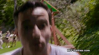 Hey, check how this sporty babe with tattoos and piercings gets banged in a wild group session.