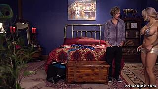 busty lezdom fucks shackled blonde anally