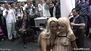 Two young teens in lingerie perform licking show at Berlin Venus fair outdoor