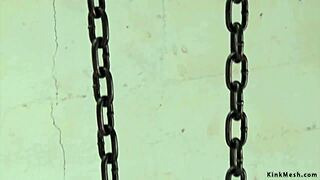 Cute Thai ladyboy teen with big fake tits gets chained for rough play.