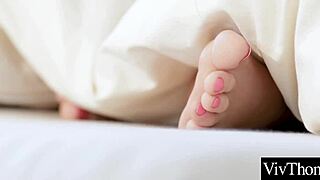Lucy Li and Vanessa Staylon engage in lesbian foot fetish sex with stockings and barefeet, licking and muff diving