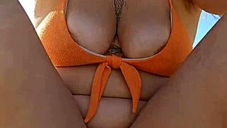 Cute petite 18+ girl jerking big cock on public beach exposing tight pussy