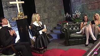 "These super hot blonde and brunette girls are sparking a wild orgy in the church with deepthroat and stockings."