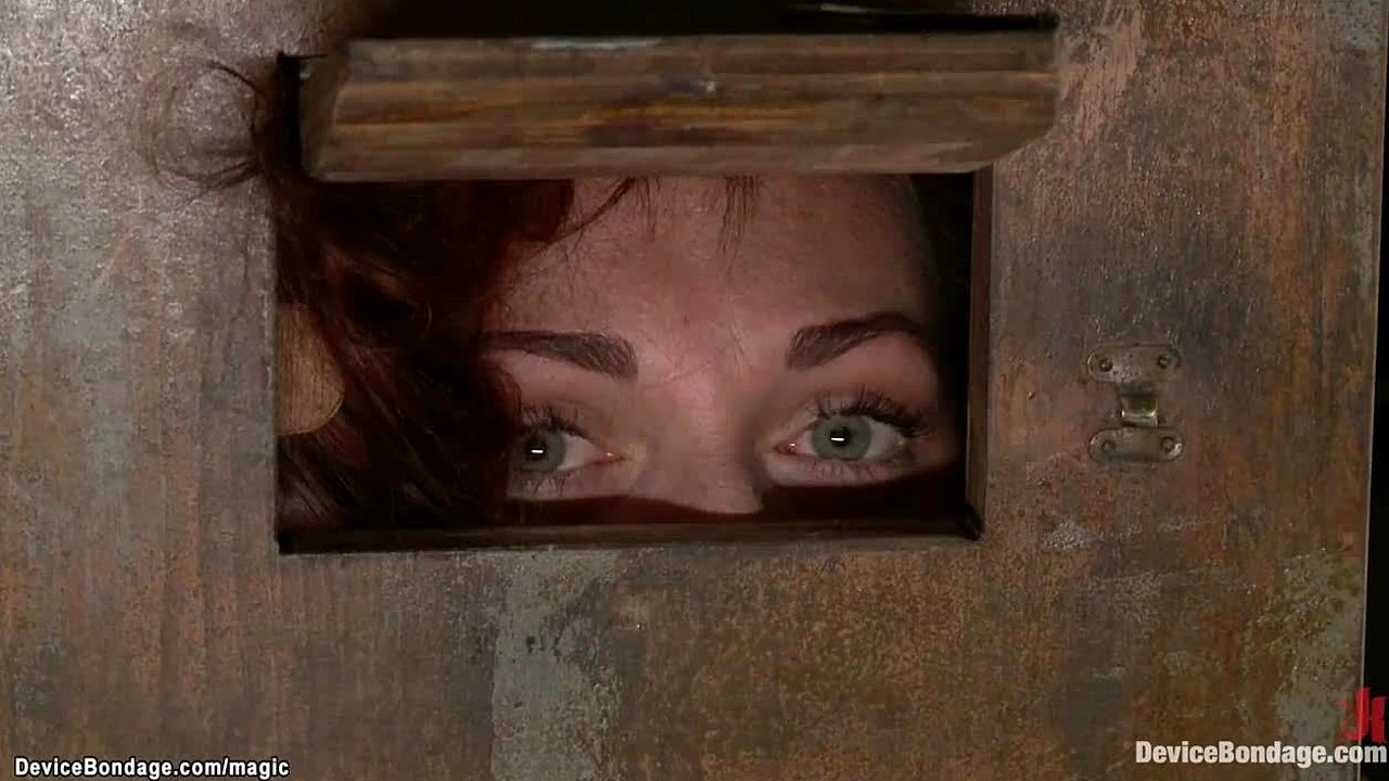 Redhead slave with neck trapped in bizarre device endures lezdom bondage and rough vibrator torment.