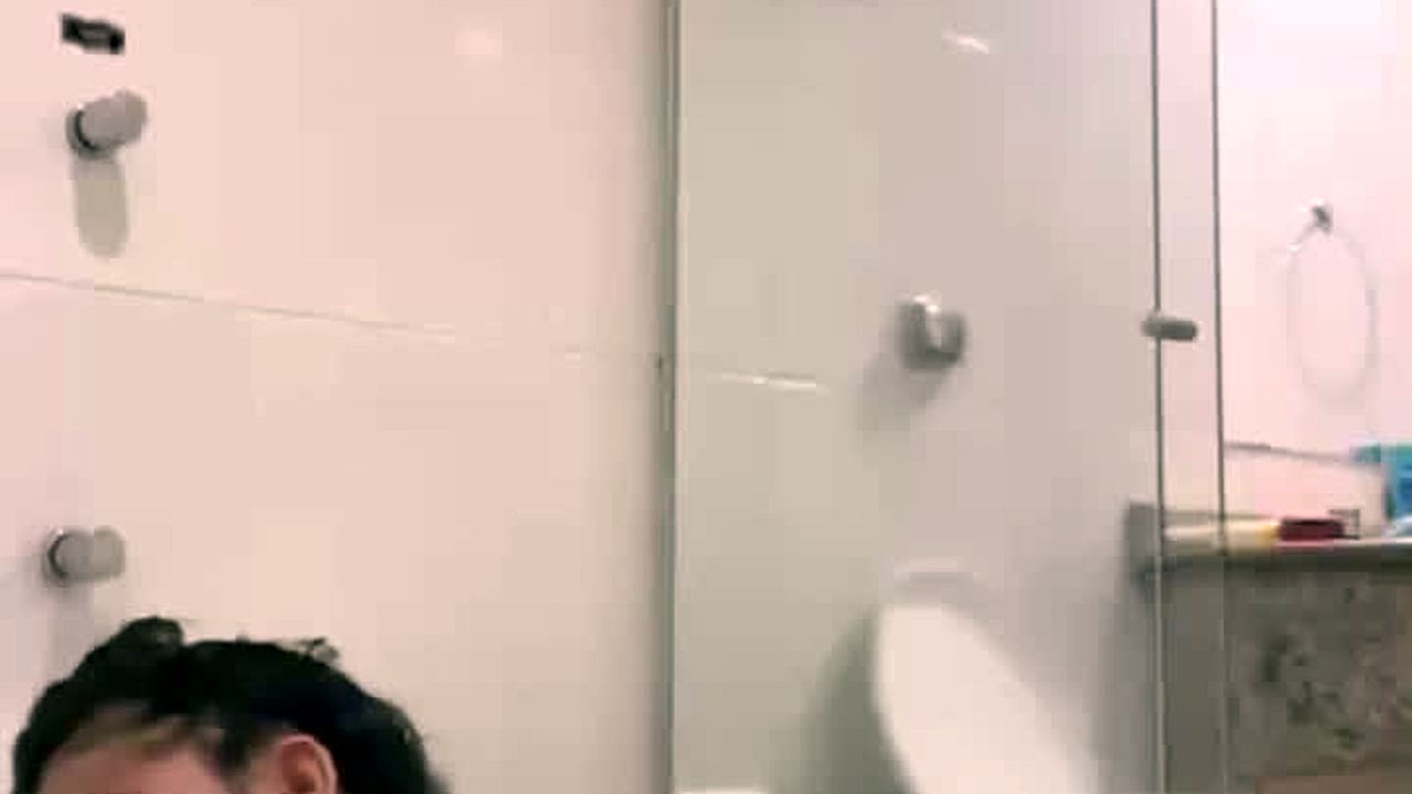 my step sister rubs herself in shower wearing latex gloves.